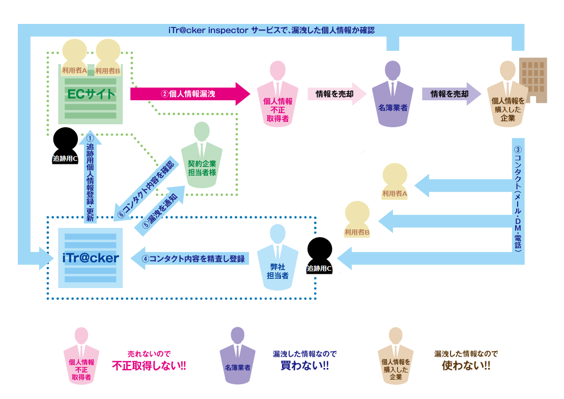 その後、個人情報が漏洩し、漏洩した追跡用のメールアドレス、住所、電話にコンタクトがあった場合、iTr@ckerに登録されたご担当者宛に、電話及びメールで連絡する仕組みになっております。
